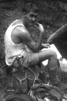 On Sunday morning some bright young Scott suggested that we might be a bit short of pitons, but as there were three, solidly embedded in the rock two hundred feet below, this really presented no problem. Just a quick before breakfast jaunt down to the pit, a 100 feet of rope belayed on a tree, a quick abseil, and presto, bang, bang, bang, bang .... ! Ugh!! .... bang, bang .... B.b. ..... bang. Meanwhile dangling in waterfall .... B. ...... b. the pitons were retrieved. All we had to do now was retrieve the sucker who got them.