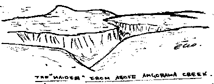 We reached the tributary about 3/4 mile below the "first fall" on Wednesday morning after about 1/2 hours walking. This spot is an excellent camp-site and bore marks of previous occupation in the form of a Huttons sausage skin. From here we forsook Angorawa Creek as it was becoming rather chunderous, and took off over the left hand ridge to "Angorawa Swamp". From the top of the hill we were able to look back towards Mount Mistake and for the first time we saw our beloved Maiden in her true perspective. It was easy to see how this hill achieved her name but since we took no photographs on this trip, let me draw what we saw that crisp morning.