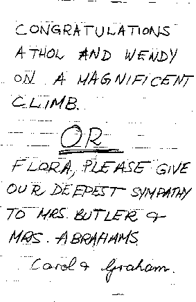 Two very relieved climbers packed gear, ate a few handfuls of peanuts and set off immediately into the dark. Going was slow and dusty, and near the tunnel we lost the track and since we could not even see each other three feet apart, and since we knew that Rae and Flora were near, we sat down and waited. Very soon we saw torches through the tunnel and were all happily reunited.