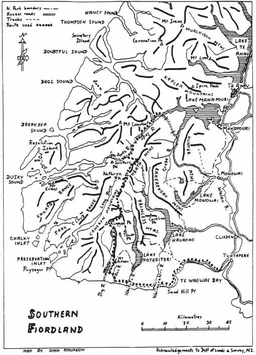 It is Christmas Eve and five of us are sitting around a fire at Lake Innes drying out our damp sleeping bags. The previous night had delivered a tremendous cloudburst that had dumped 12 inches of rain in a three hour drenching. However this is almost normal in Fiordland National Park in the south west corner of the South Island of New Zealand where the average rainfall is 1 inch per day. The park is renowned for the world famous Milford Track and Milford Sound in the north of the park but our objective is the rarely-visited Cameron Mountains in the south and is surrounded by fiords extending inland for up to 50 kilometres. We expect the walk will take at least 18 days if we are lucky with the weather and there is always the possibility that the weather will repel us completely.