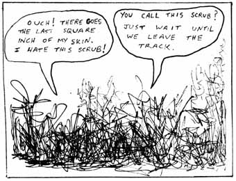 Locating our campsite at Islet Lake was difficult under the prevailing weather conditions. Thick scrub aggravated the problem, but it was great to travel through as it was everchanging and like nothing on the mainland. Just as we were on the point of aborting the search. David yelled out, "Lake!" That evening as I lay under the fly I was dead-dog tired, yet happy, despite water getting into everything and the cramped conditions. It had been a rewarding birthday for me, and I forgave Ashley and David for breaking with tradition and not carrying in a hogget to celebrate with.