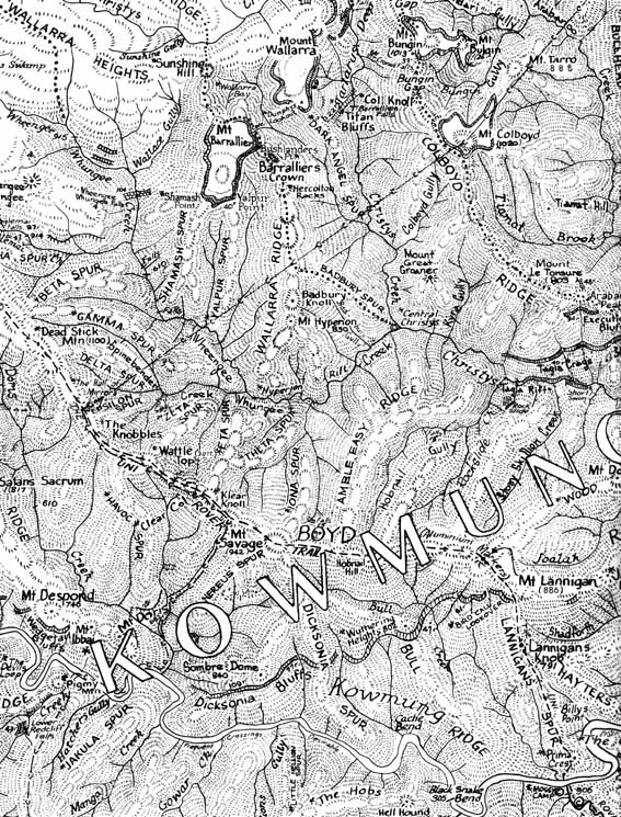 Since returning to Sydney, I've been parrying requests to explain the Gundungura map of the Kowmung Country which I produced while at Sydney Uni. An article for the 50th Anniversary of the Sydney University Bush Walkers (SUBW) is as good or better way as any other to do so. I won't cover route notes which are dealt with in the Gundungura booklet.