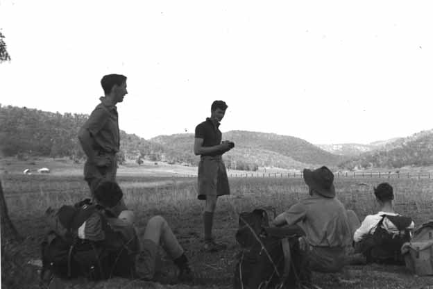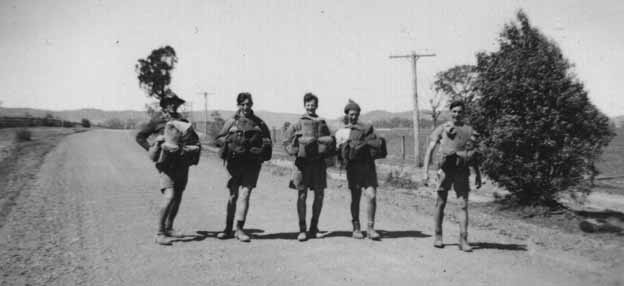 Above - The beginning of the walk, not far from Denman: Left standing Alan Tapsell, left sitting Quentin Burke?, centre standing Charlie Crossman , centre right sitting ?, right sitting Vern Gilbert. Photo - Fred Doutch.