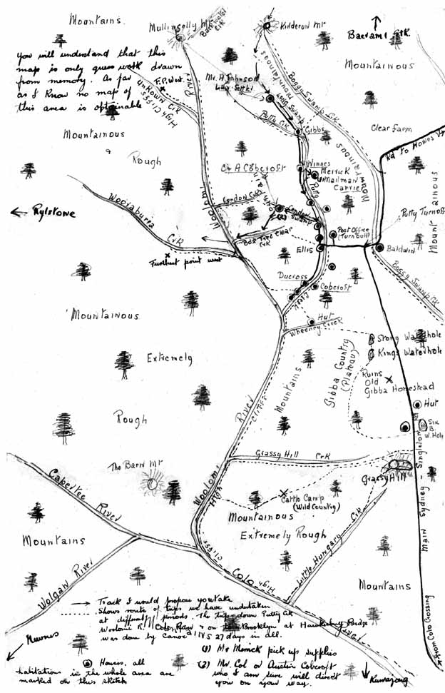 You have certainly picked on a trip of trips this time, as you say the blank spaces on a map have a strange fascination for belated explorers of our ilk. Believe me, the route you suggest is a tough one. I have at times been over most of it east of the Woolomi Rv, as you will see by the enclosed rough map, or shall we say rough outline of this piece of Australia in question, at the most we have never been 10 miles west of the said River and that only in two spots, each of which were deuced tough, water being the main drawback. Your best plan on arrival at Putty would be to contact Mr Col or Austin Cobcroft (refer to map) who know this country west well & could on the spot direct you far better than any map, or for that matter any man in NSW.