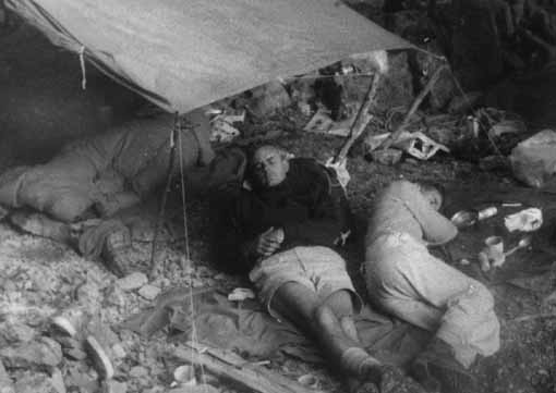 Beer consumed, Dick reasonably comfortable, and our doctor recuperated after his climb down, then our climbers led the way back up the cliff to the top. We sat down and prepared for Sunday night, happy in the expectation of the arrival of our "few rovers" for assistance.