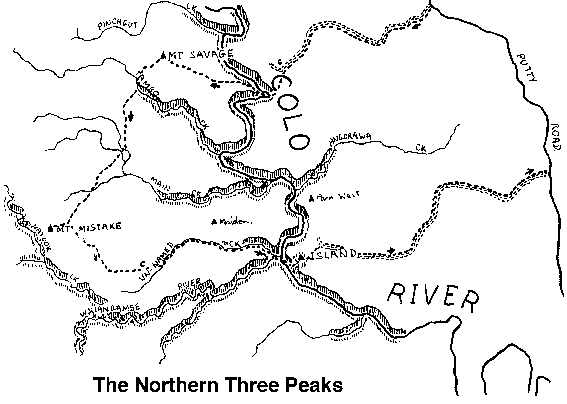 In retrospect, we thought the Northern Three Peaks: Savage - Mistake - Island, from the Putty Road, was an excellent "burn" walk. It is roughly as hard as the traditional Three Peaks, the main difficulties being scrub, route-finding and navigation. It is about 40 miles long and has approximately 10,000 feet of climbing. A harder alternative would be the Four Peaks, including Mt Barakee. We weren't sure how long the Northern Three Peaks would take and had an extra day in reserve. Except for the night roadbash, the walk took only a day and a half.