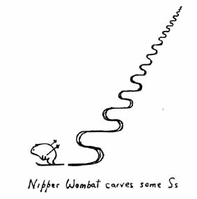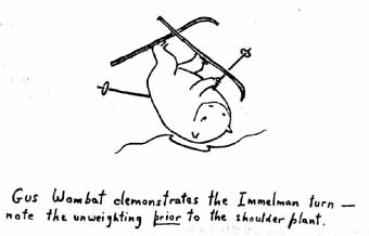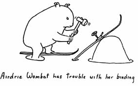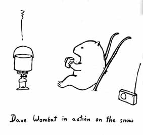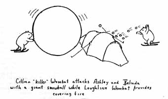 The year for many of us started in July with a trip to the Wombat Creek/Snowy Plains area. The snow was fresh and wet and a strong wind blew most of the weekend. We had the Bhagwan, Mule, Noodle, Doodle, Boy, and His Nips. In all it was a typical early season weekend, with apparently complete snow cover occasionally opening up to swallow us. The ski-eating scrub monsters still not quite in hibernation. The Bhagwan's holiness did not save him, indeed his pre-NZ-diet-integral-forward-mounted-load-balancing -attachment (big stomach) seemed to be attractive to the cholesterol liking monsters.