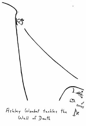 With McGus shortly leaving for Sale before going overseas we managed to fit in a weekend trip with him. Noodle, Doodle, Boy, and His Nips drove to Canberra and were joined by McGus there. Heading up towards Twynam from Guthega, we camped in the Pounds Creek area. The weather was good and the snow not too bad. Saturday afternoon saw us skiing up Twynam with good wind assistance. We put parkas on to act as sails. We zipped along the tops to near Carruthers where we suddenly had to stop as visibility fell to a few metres. Inching along we, sidled across the large cornetto that lives in this saddle and dropped into the non-lake branch of Blue Lake Creek. It was here that we found the one and only Wall Of Death. It's a steep slope in a bowl that ends in a short jump opening out to a gentle creek. When covered in snow it make the perfect ski jump. His Nips was first down, sidling the really steep bit before plunging down to exit over the jump leaving a perfect set of tracks. McGus gave it a good crack, always managing to stay slightly steeper than His Nips. Noodle was like a gentleman as he gracefully swept around in a great arc, sidling across the steep section and so not risking life and limb. Doodle, a little nervous perhaps, did likewise, before slipping and plunging screaming to the bottom, about 20 feet below. Boy, like the true hero he is proceeded to jet straight off the top. Hit the steepest section in a tuck, whoosh over the jump and crash in a heap. A great effort, but a mere taste of things to come.