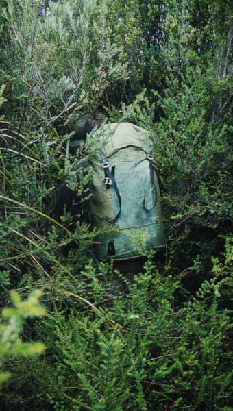 Water was a serious problem in the POW range. There are no little creeks, lakes or tarns that are abundant in other Tasmanian mountain ranges, despite the very high annual rainfall of this area. Apart from some mist and light drizzle near Diamond peak, we had no rain since before the Denison and we were not going to get any more till the end of the trip. The only available water was in tiny yabbie holes. These we drained with lengths of plastic tubing into a canvas water bucket. Luckily we all brought tubes of different thicknesses and could join them end-to-end. At the northern end of the range, yabbie holes were easy to find and were well stocked, but by Southern Bluff, we were only locating one yabbie hole per day and had to go a few hundred feet down off the side of the range and wait a long time to get a few pints of water. None of us carried proper water bottles because, after all, this is Tasmania, the island that sinks into the Southern Ocean every few days. We were forced to improvise, and my water carrying device was a rusty Milo tin. The scrub was getting dusty and the moss was turning brown. Ahead of us, the yabbie holes ceased altogether and for the next five days, the only water we had (with one exception) was moss juice squeezed through a handkerchief.