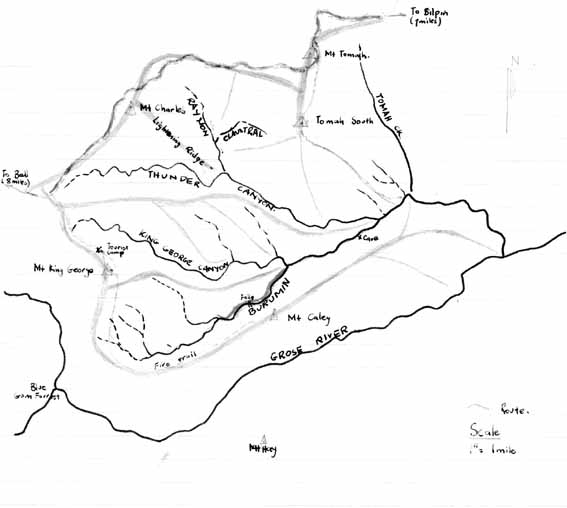 Sunday morning, after another surprisingly warm night, & a terrific porridge-like breakfast we set out. After a little while reached Thunder Canyon (- opened out considerably here -) changed into dry clothes & began looking for a way out - no luck & Dave led us as far downstream as the tributary running into Thunder Canyon from the left just before Tomat Creek & there we found a terrific spur leading up onto South Tomah. (We needed to use a pack rope twice to pull our packs up small cliffs at the beginning).