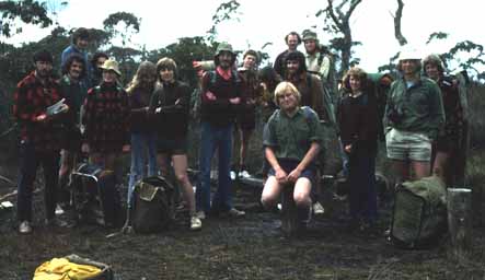 Above- The 1975 PBT party. L - R Chris Cosgrove, Peter Young, Meg Shirlow, Col Mathers (obscured), Bronwynne Cosgrove, Barbara Eason, Adrian Teague, Lloyd Flack, Tim Herborn,, ?, Ross Bradstock (front), Steve Williamson (middle), Peter Woof (back), Dave Brown, Vicki Eason, Ian Hickson, Col Southwell. Photo by David Noble