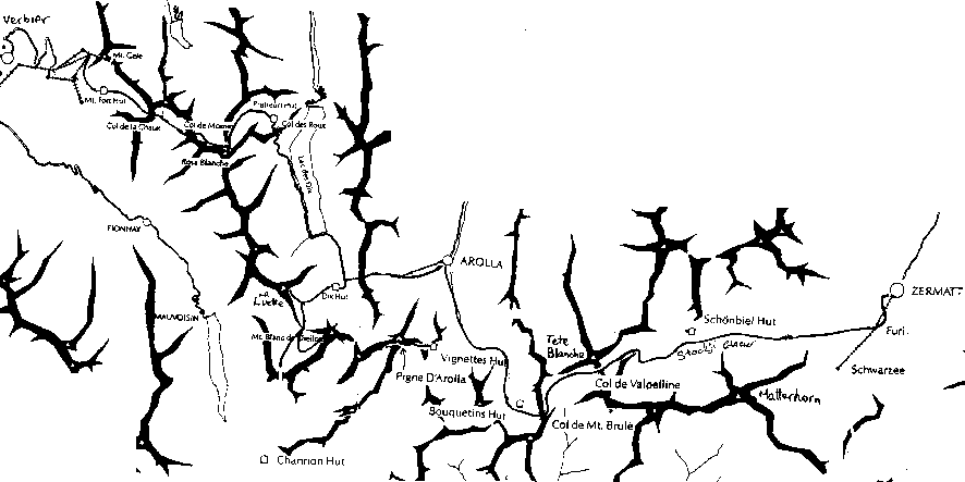 Unsure of the seriousness of the last day into Zermatt, Bill and Ben decided on another day trip, to check out the lie of the land. It was certainly excellent land! They climbed to Col de Valpelline (3600 m) in beautiful weather, and started to climb Tete Blanche. However Bill's involvement with a small avalanche and his dislike of climbing slotted country unroped put a premature end to this. Back to the hut! But the day had been a success, not the least because it had taken the pair into Italy, and so another country had been bagged.
