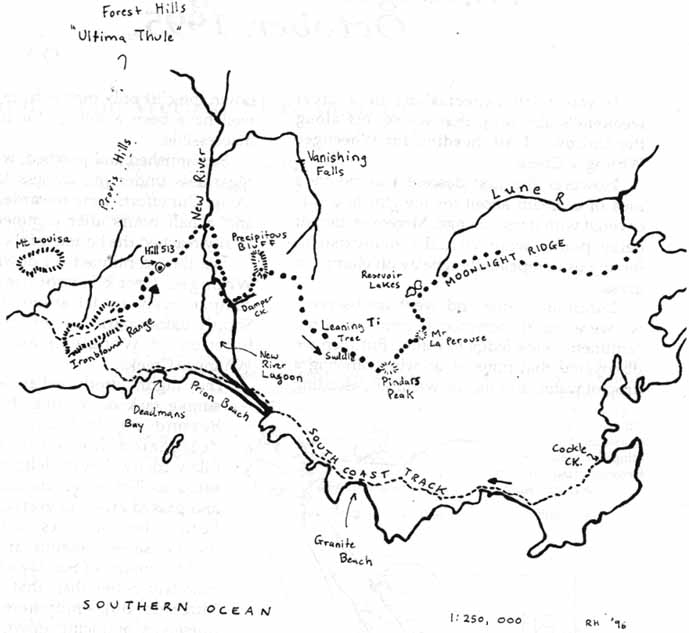 On the third day, we made the gut-wrenching 800 metre ascent of the Ironbound Range in hurricane-like conditions. About three-quarters of the way up, we stopped for a miserable, wet lunch consisting of raw Vitawheats. We bagged the true summit in incredibly windy conditions -- the wind gusts must have been of the order of 100 km/hr. They were so powerful that we simply could not walk in a straight line -- one would try to tack into the wind to stay upright; but a miscalculation usually resulted in a spectacular crash. The only redeeming feature of the day's effort was the magnificent view from the Ironbound summit which was dominated by the expanse of the Southern Ocean, the flatness punctuated by a few tiny islands. We pushed along to a small saddle in which to pitch our Paddy tents. We had quite a wild night in our tents as Huey tried his darndest to blast us of the ridge.