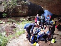 On the way - we overtook a UTSOAC party doing an optional early abseil and ran into another UTS party on the second abseil. We found an alternative belay point and abseiled into the canyon. In the creek - the water was up promising us an adventure. We continued down a nice gorge section of the creek and soon arrived at the lower canyon section. This began with a nice abseil down a waterfall into a dark pit. The current was strong enough for John to loose one of his volleys in the dark pool. Then followed two short abseils. Some in the party injured their knuckles on one of the drops - and another major mishap occurred when a (very fancy brand new!) GPS device slipped out of Chuin Nee's pack and vanished into the torrent. Despite a lot of searching - it was not found.