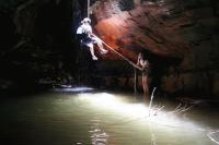 We met up at North Richmond outside the bakery and then the convoy of cars travelled to near Bell where we met up again and got gear ready for a shot daytrip down the canyon. The start of the track was hard to find. It was a little overgrown and vague after recent bushfires. But is was not too bad and the big party made fast progress to the creek and soon got into the canyon section. This starts with a short abseil into a pool. With a large party - and not enough harnesses - we had to pass gear back up the rope a few times. A few of the party became impatient and decided to jump down the drop. Thanks to Albert (Al-Bear) for helping everyone with clipping on the rope and Rob and Lana for some bottom belaying.