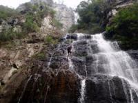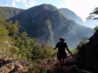 Wednesday we did Kalang falls, and it went as smoothly as anyone could ask. A spectacular trip, with many excellent abseils. I will let the photos speak for themselves. The weather was fine and sunny. even if the photos look cloudy. The lack of wind meant that the bushfire smoke had settled into the valley and didn't clear till mid-afternoon, leaving a smoky haze in the canyon. We exited via the ridge to the right of murderind gully: Steep and scrubby, but fast. An early arrival back at the cars meant time for beers and a quick wash at the Boyd river campsite before settling in for the night.