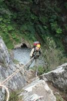 300m further on was another gigantic 60m abseil in stunning surrounds. Then After dealing with that the group spread out a bit, Dave and Glen going ahead to rig the next pitch while the rest of us followed in good order. We regrouped at the next 20m drop but where was Doug and Rachel? I went back to find out, and it turned out their progress had been suspended due to injury time. Doug had a bit of a cut on his leg but Rachel had a broken hand. Actually, we didn't know it was broken at the time but it certainly appeared to be a serious injury, so serious in fact that Rachel had to do the remaining abseils left-handed. This included the final 60m drop! But no one was deterred from completing the canyon, least of all Rachel herself, and it took some hours of steep scrambling and creek walking before we finally decided to stop just on dark. We had to make to with what was available for camping, but it turned out to be quite comfortable once we were settled in.