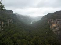 After about 500 metres the creek crossed the road, and we decided to ignore the earlier private property sign, assuming it was too wet and miserable for a redneck to be sitting on a porch stroking a shotgun anyway. We climbed a lovely pass at a fork in the valley, with a nice dry cave half way up, and a spectacular lookout on top. We took a few photos, but the wind was cold so didn't pause too long.
