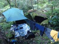 We continued on through this impressive gorge, warming up a little as we did. We had just passed a dead floating animal in the water, when we found a small flattish area about 1 hour before dusk that would suffice for our campsite – with a few leeches and stinging nettles.